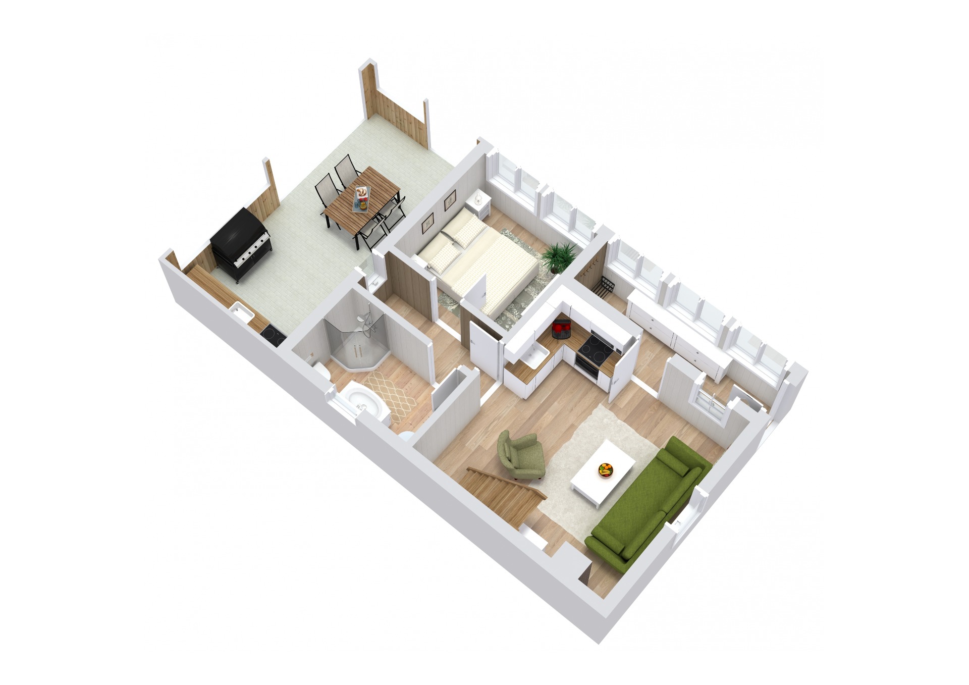 Koupelna je vybavena vanou, toaleta je samostatná. Podlahy tvoří plovoucí podlahy v obytných místnostech a dlažba v koupelně a zázemí.