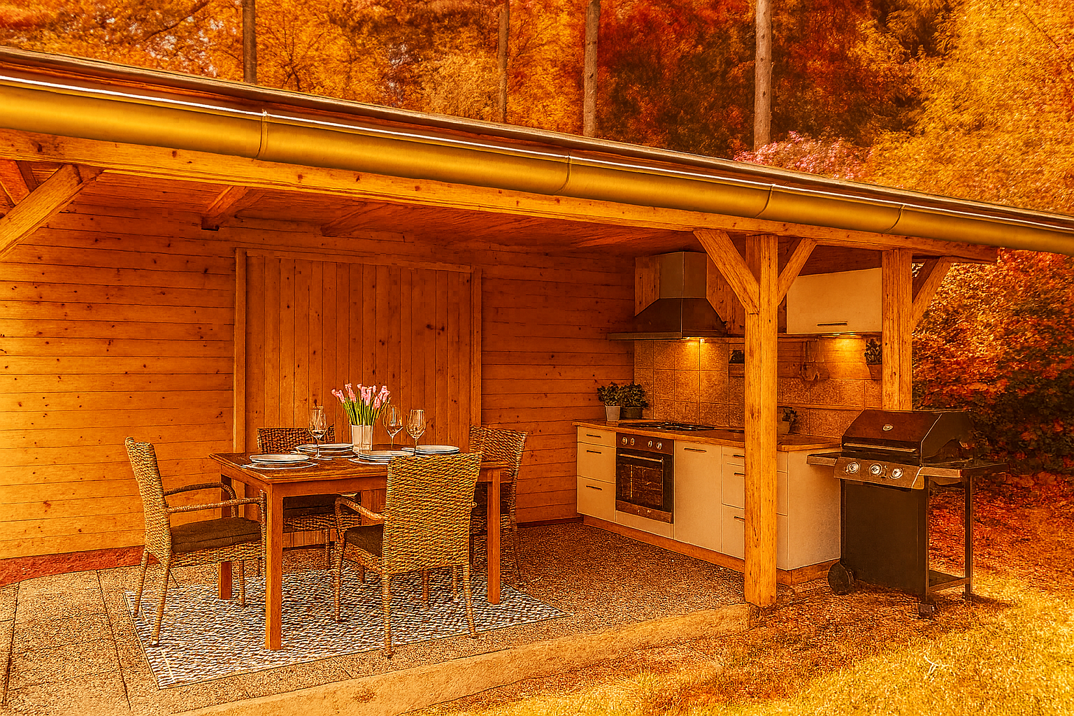 Pod jeho ochranou najdete velkorysou pergolu – ideální místo pro venkovní kuchyni, grilování, rodinná posezení i tichá rána s kávou a knihou.