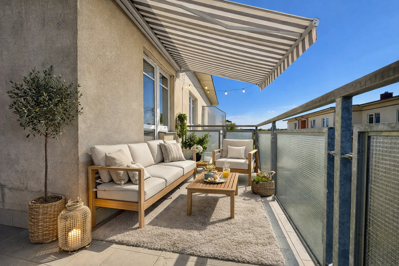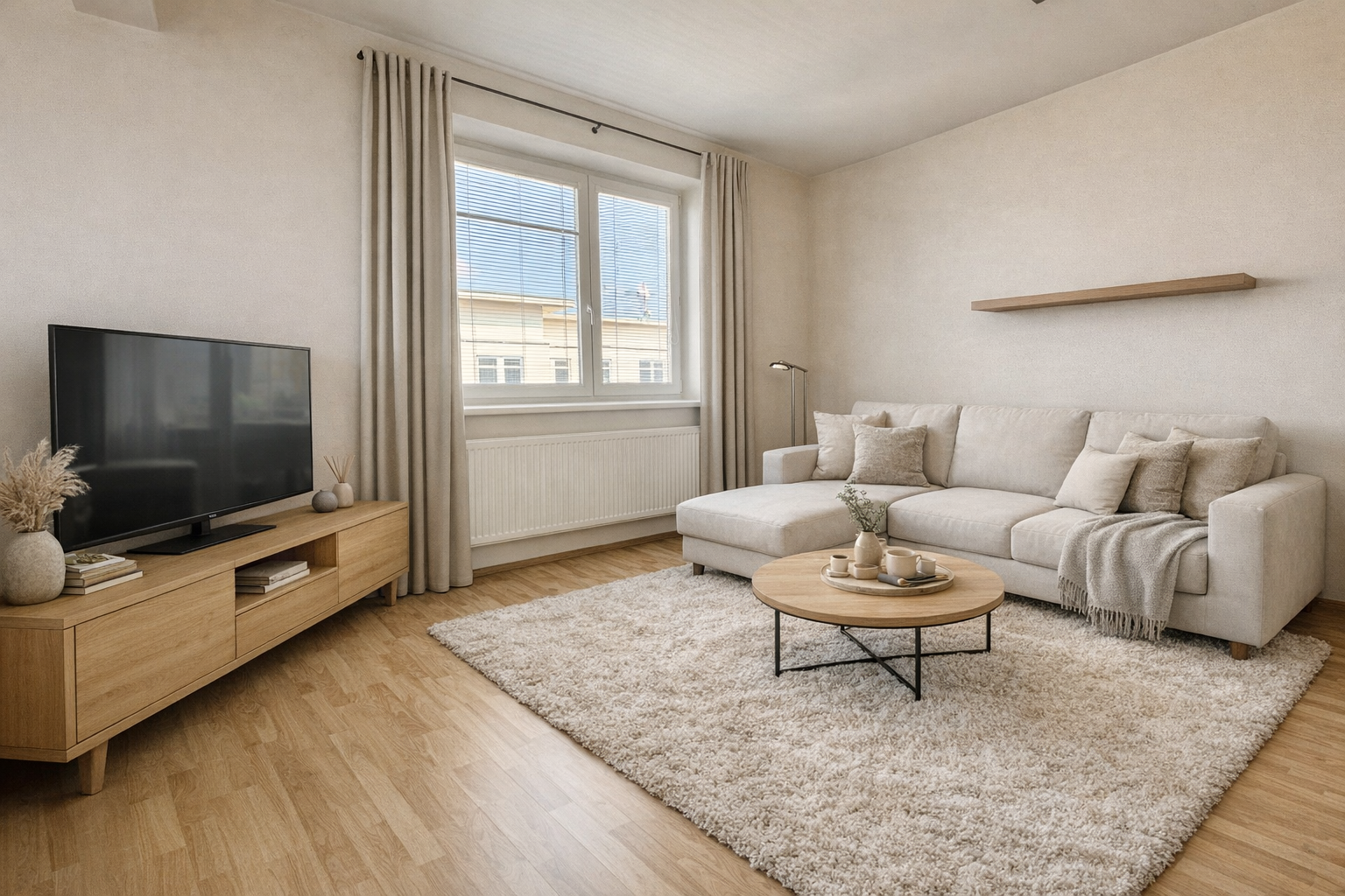 Z obývací části je vstup na prostorný rohový balkon, který poskytuje ideální místo pro ranní kávu, relax i příjemné posezení.