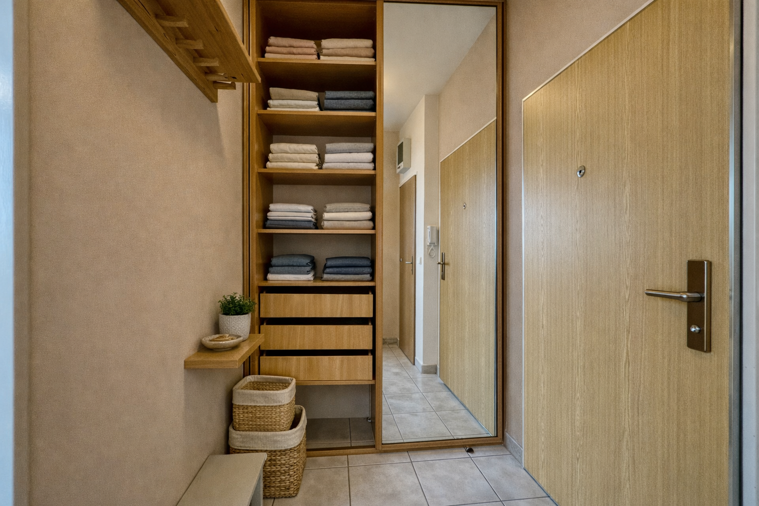 V předsíni se nachází velká vestavěná šatní skříň, která zajistí dostatek úložného prostoru. Koupelna je společná s toaletou a disponuje velkou rohovou vanou, která nabízí pohodlí po náročném dni.