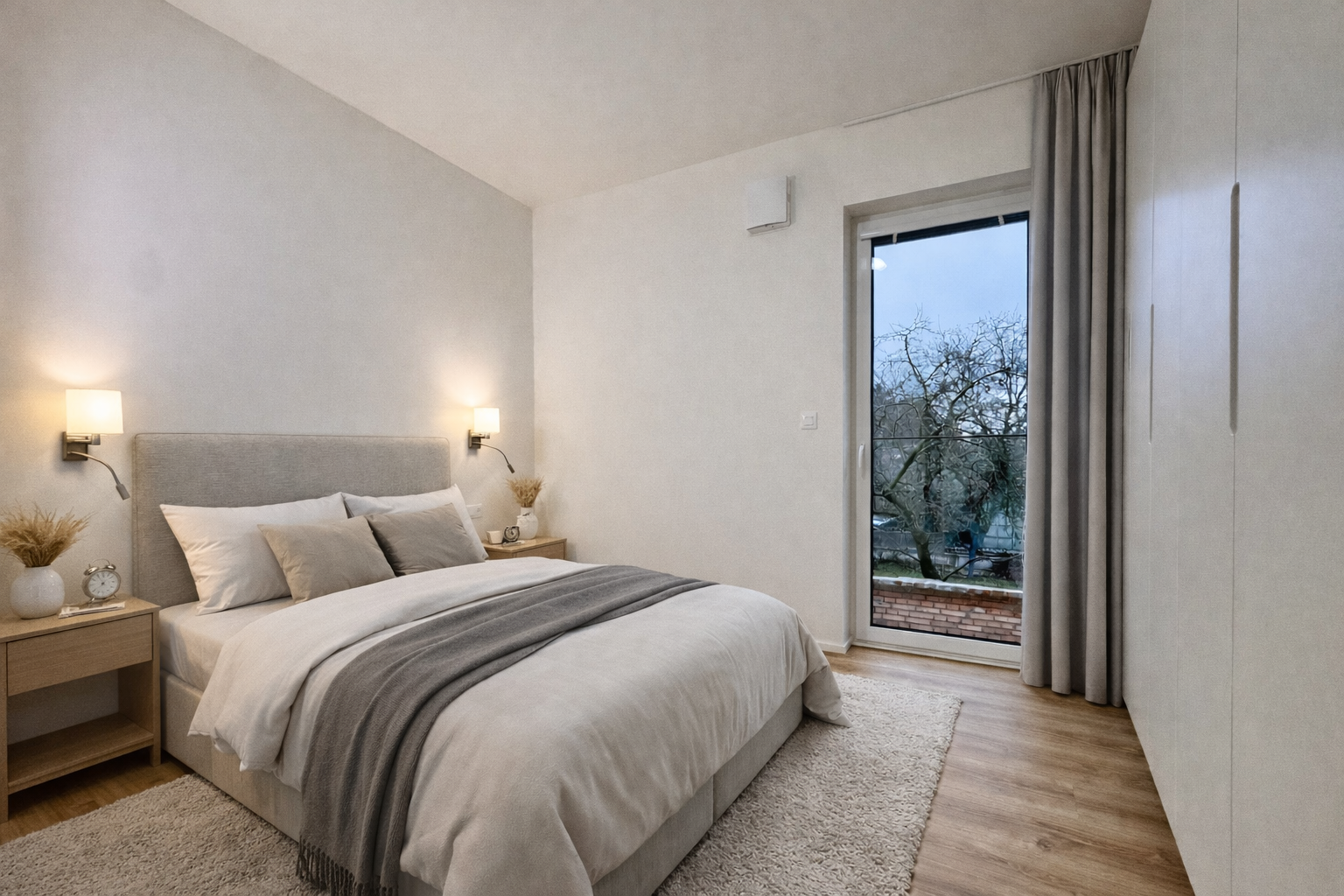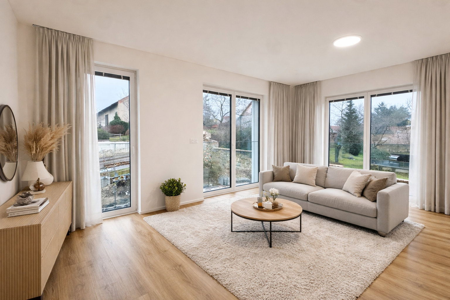 Dominantou bytu jsou francouzská okna ve všech místnostech se skleněnými zábradlími, která zajišťují dostatek denního světla a pocit otevřeného prostoru. Komfort bydlení dále podtrhují venkovní elektrické žaluzie, díky nimž si snadno nastavíte ideální světelné podmínky i soukromí po celý den.