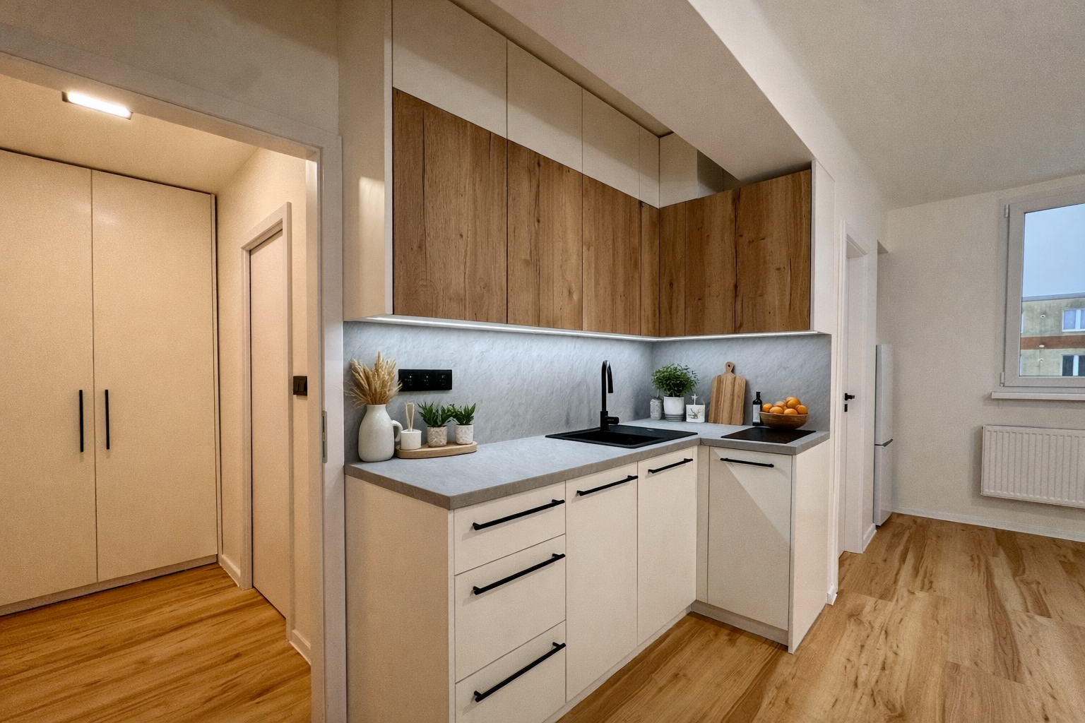K pronájmu nabízím velmi pěkný byt 2+kk o výměře cca 40 m² v Roztokách u Prahy, který prošel kompletní a právě dokončenou nákladnou renovací. Byt je připraven k okamžitému nastěhování a osloví zejména zájemce, kteří hledají nové, čisté a funkční bydlení bez kompromisů.