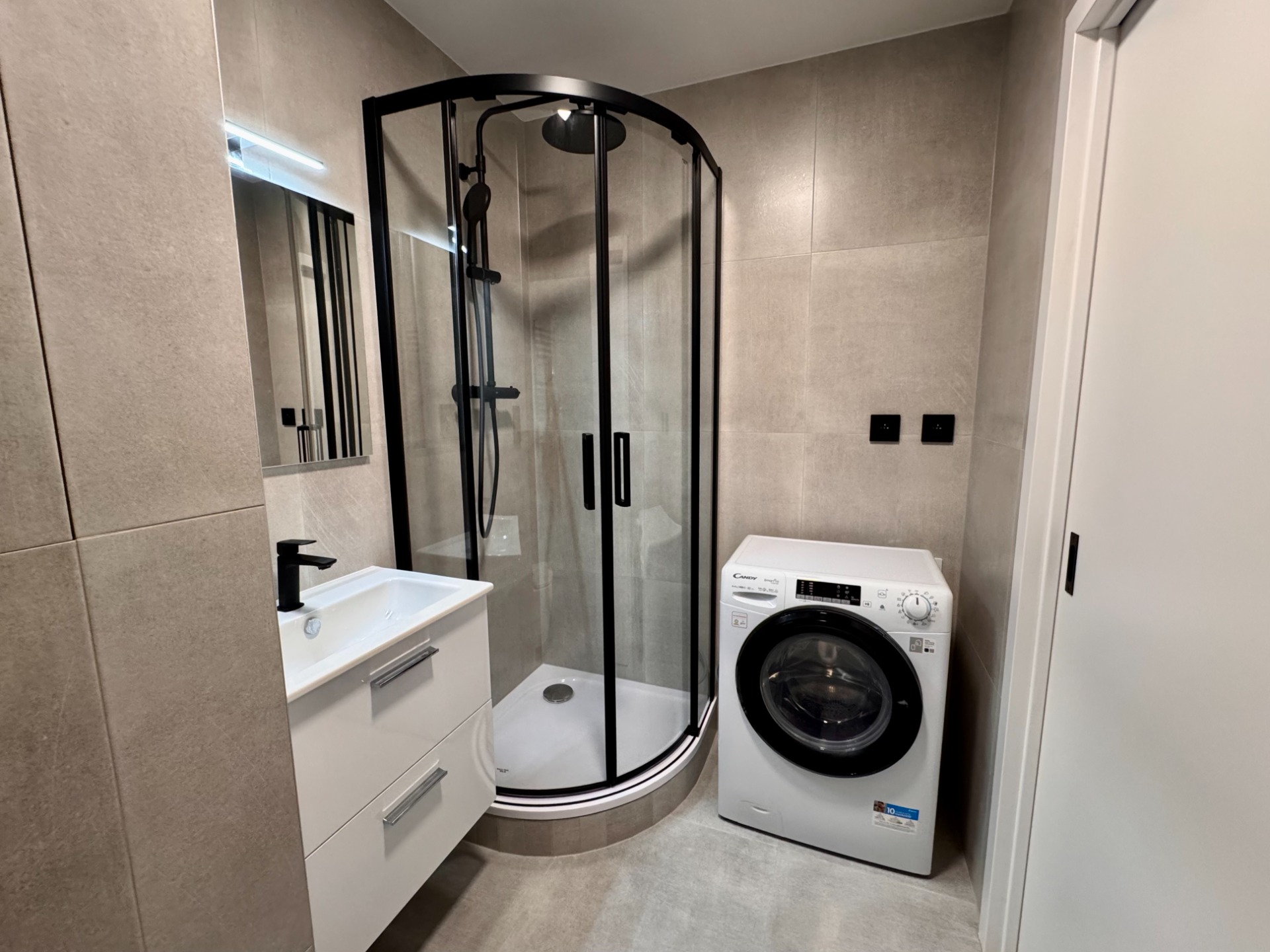 Koupelna s toaletou je moderní, se sprchovým koutem s kombinovanou sprchou a zároveň zde najdete pračku se sušičkou, což výrazně zvyšuje komfort bydlení. V chodbě je k dispozici vestavěná šatní skříň, která poskytuje dostatek úložného prostoru.
