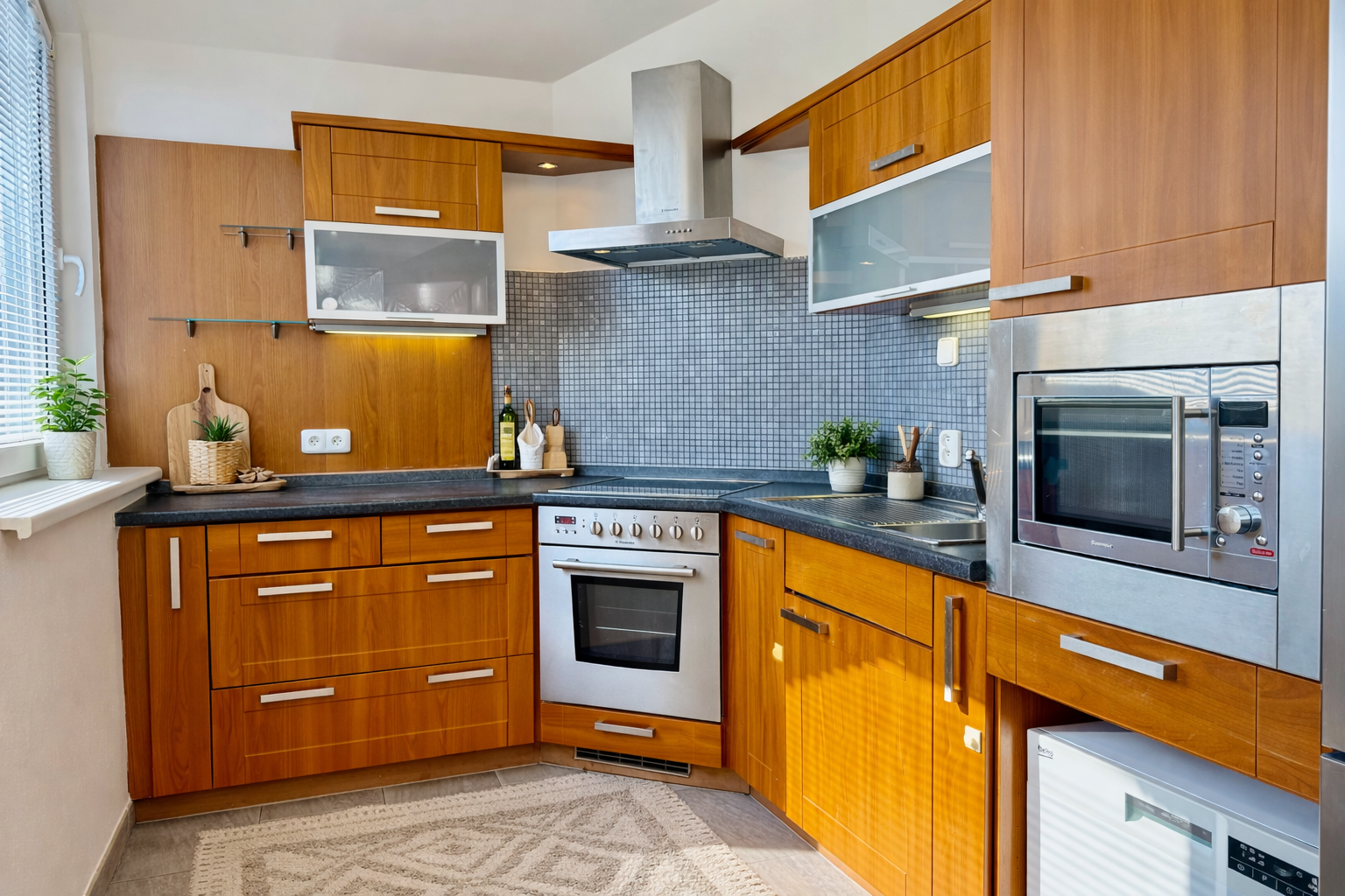 Jedná se o půdní byt s příjemnou atmosférou, vzdušným prostorem a promyšleným dispozičním řešením. Dominantou bytu je světlý obývací pokoj s kompletně vybavenou kuchyňskou linkou se všemi vestavěnými spotřebiči. Byt je klimatizovaný, což výrazně zvyšuje komfort bydlení zejména v letních měsících.
