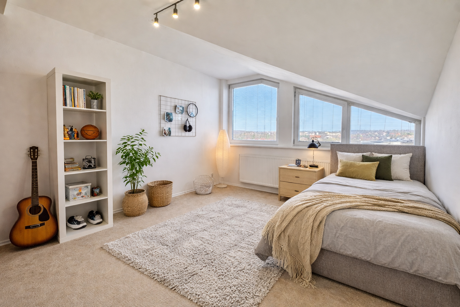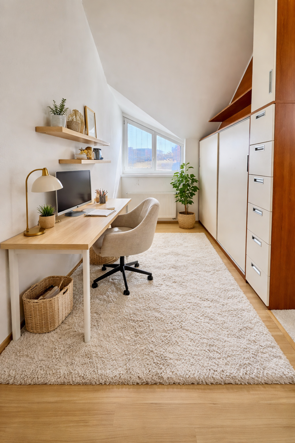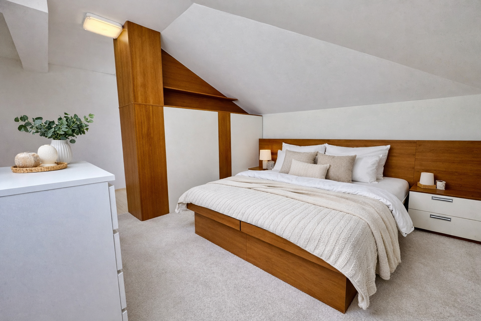 Velkou výhodou jsou dvě prostorné neprůchozí ložnice, které poskytují dostatek soukromí. Hlavní ložnice nabízí nejen šatnu, ale také prostor vhodný pro domácí pracovnu nebo klidný pracovní kout. Druhá ložnice je rovněž velmi prostorná a disponuje velkou vestavěnou skříní.